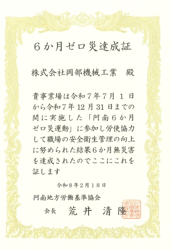 取り組み 2026.02.19 6か月ゼロ災 達成 阿南地方労働基準協会から6か月ゼロ災達成証を頂きました。 令和7年7月1日から令和7年12月31日までの間、6か月無災害を達成しました。 今後も安全ルールを守り、ケガのない、明るい職場作りに努めて参ります。 … MORE